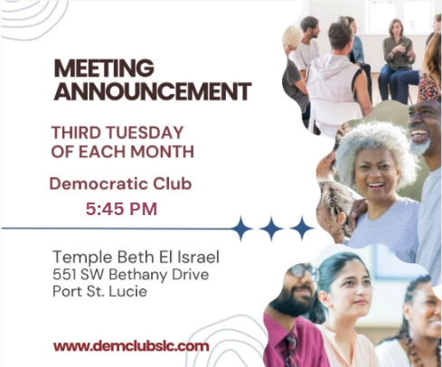 The joint meeting of the St. Lucie County Democratic Executive Committee and the Democratic Club of St. Lucie County is held the third Tuesday of the month beginning at 5:45 pm for the Democratic Club of St. Lucie County (Dem Club) and for the St. Lucie County Democratic Executive Committee (DEC) at 7:00 pm.