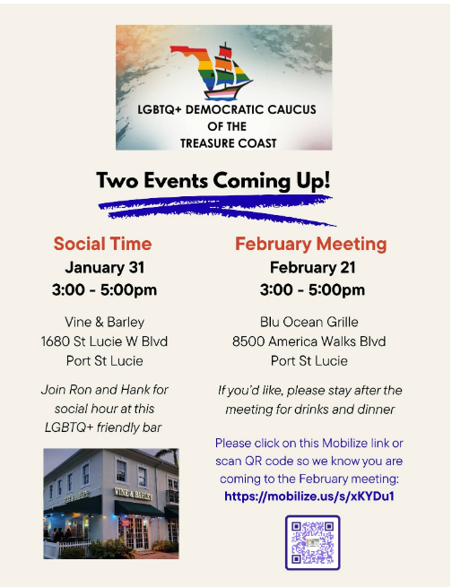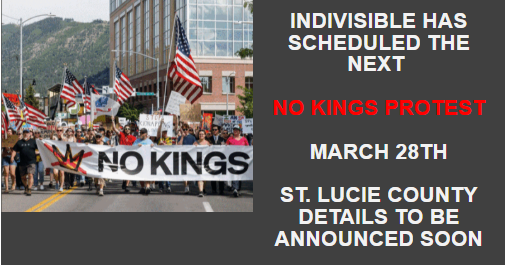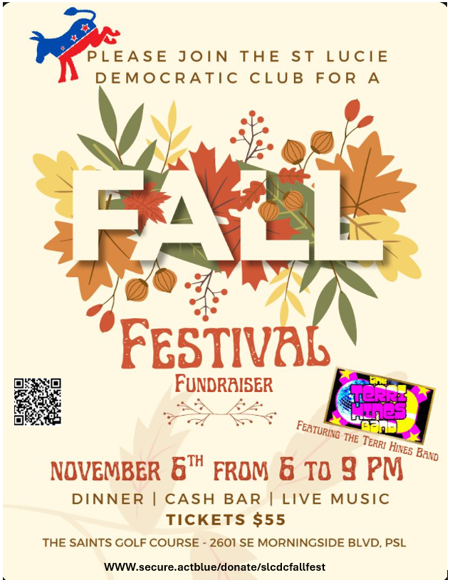 The events listed on this calendar are provided for informational purposes only. The inclusion of any event does not constitute or imply endorsement, sponsorship, or responsibility by the Democratic Club of St. Lucie County for the event’s content, organization, speakers, or outcomes. Unless explicitly stated, events are not organized, hosted, or managed by the Democratic Club of St. Lucie County. Participation in any event is at the discretion of the individual, and the Democratic Club of St. Lucie County assumes no liability for any actions, representations, or materials associated with events shared herein.