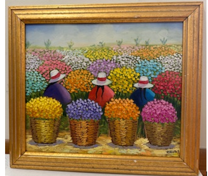 Bursting with vibrant color and cultural charm, this original acrylic painting captures the lively spirit of a Peruvian folk-style flower market. Featuring richly textured baskets and figures set against a sea of blossoms, it’s a joyful statement piece that brightens any room. With an estimated value of $200, it’s a wonderful addition for lovers of bold, expressive art.