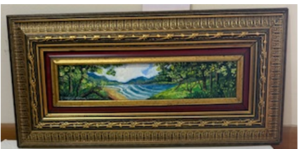 This original panoramic landscape painting captures the serene beauty of the Latin American countryside, with lush greenery and tranquil water stretching across the horizon. Richly framed with ornate detailing, it adds warmth and depth to any room. With an estimated value of $150, it’s a charming piece that brings a sense of calm and natural beauty to your space.